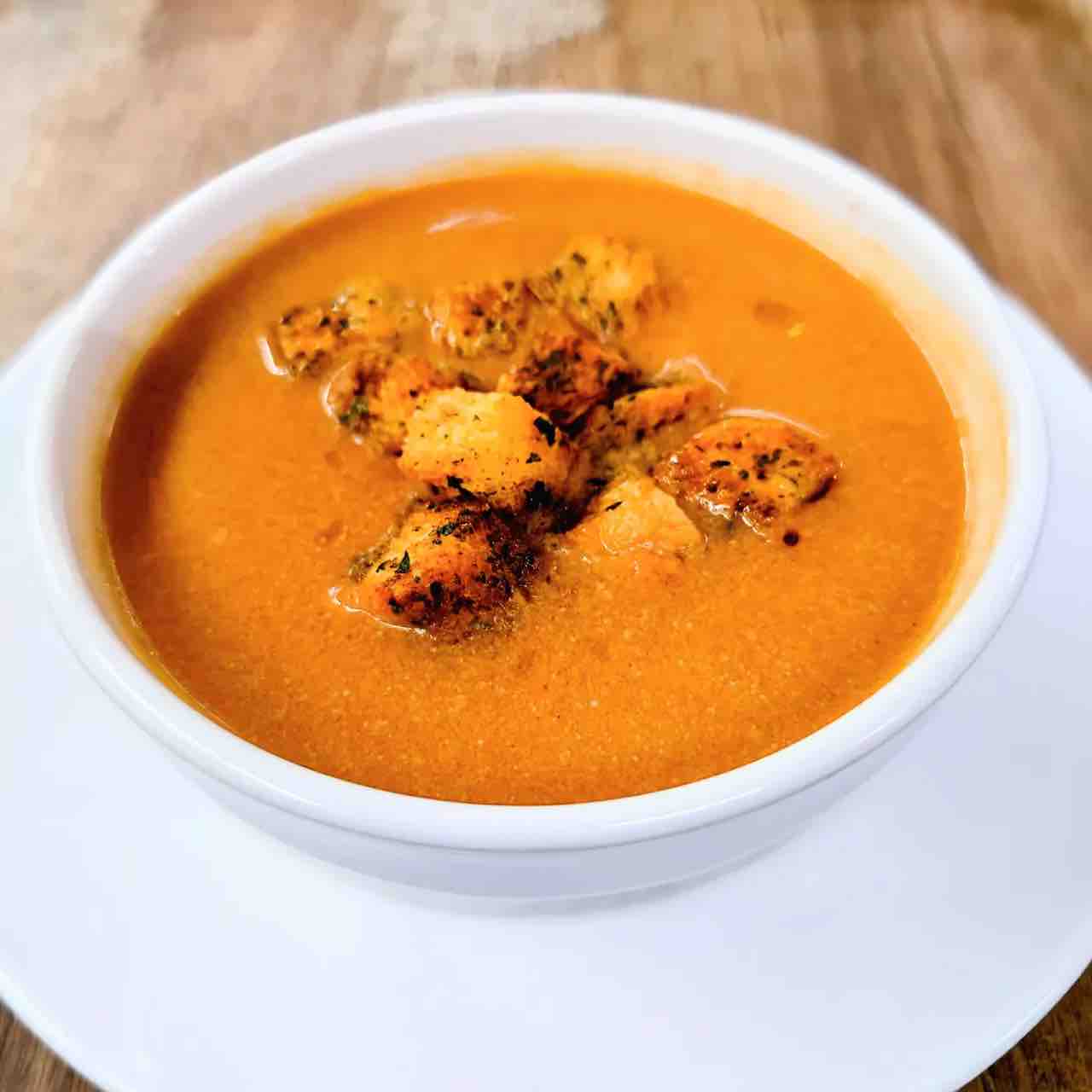 オマールの殻とトマト、野菜からとった濃厚なクリームスープ